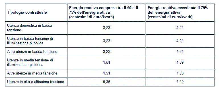 • potenza reattiva oltre il 50% ma meno del 75% della attiva: si pagano c.ca 0,0323 €/kVAh (su TUTTA la potenza reattiva, ma è un dato da prendere col beneficio del dubbio)